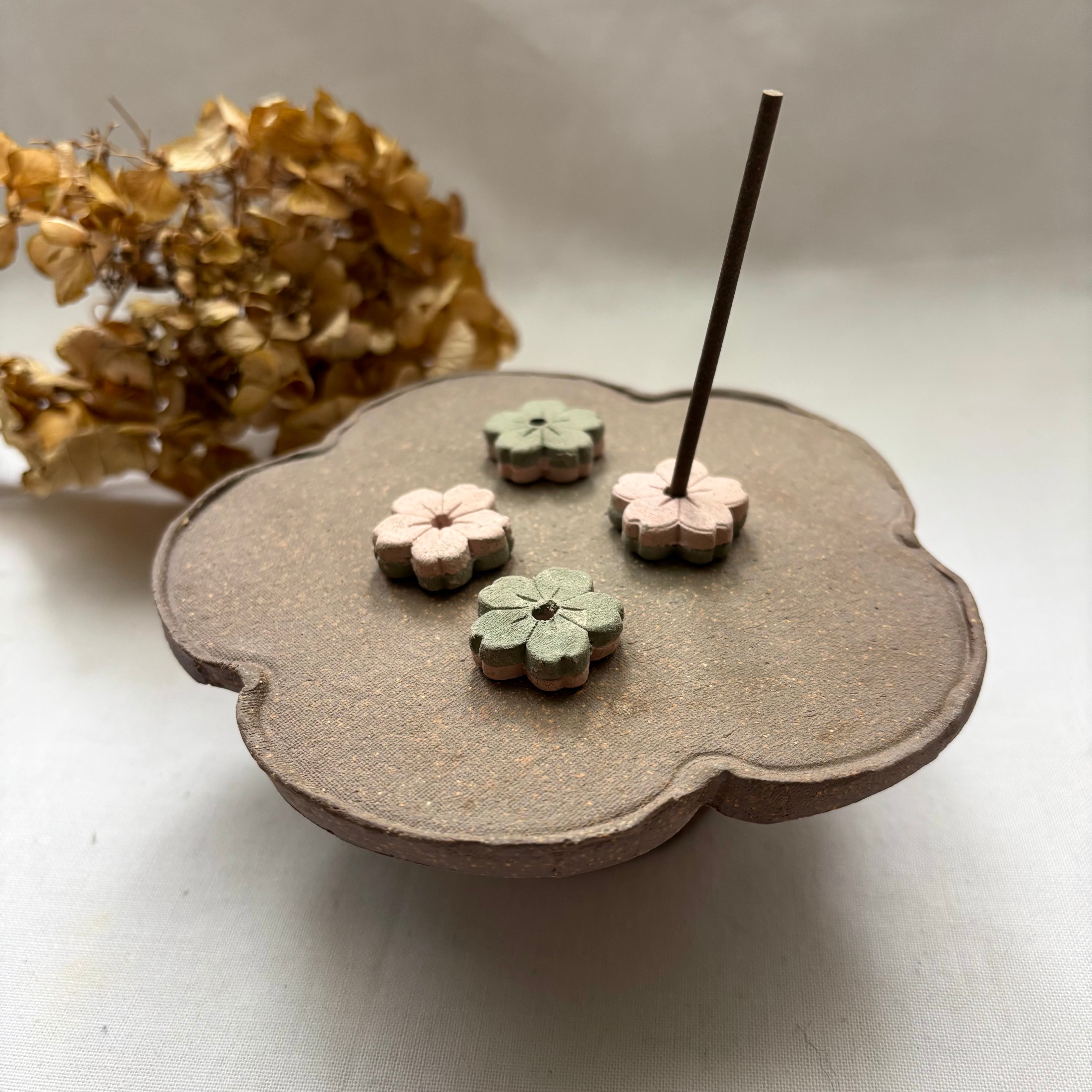 焼き締め(釉薬を使用していない)ので、お香を炊いた際の灰やコゲなどで汚れがつきやすいです。ご了承ください。